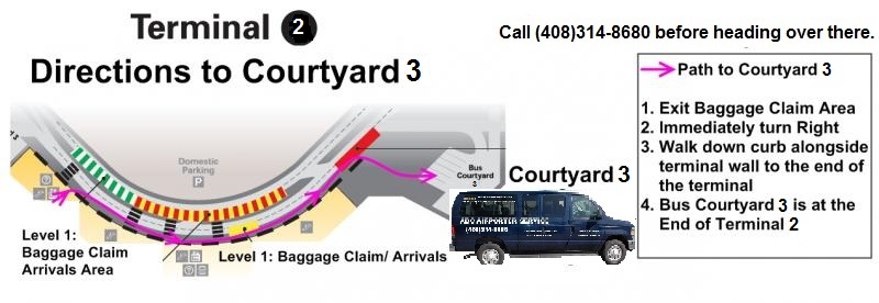 Terminal 2 - is the Domestic Terminal. Here you'll collect your luggage and come out to the arrivals curbside. Walk towards Door 4 which will be to your RIGHT and you'll come across a sign which reads Courtyard 3 and when you look to the right there will be a empty parking lot and your shuttle will pick you up from there. Please call before heading over there, it can take a driver 5 - 10 minutes to get there from the cell phone lot.